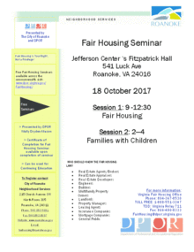 For more information about Fair Housing Law: Virginia Fair Housing Office Phone: 804-367-8530 TOLL FREE: 1-888-551-3247 TDD: Virginia Relay 711 Fax: 866-480-8333 FairHousing@dpor.virginia