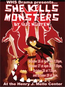 WHS Drama presents SHE KILLS MONSTERS, by Qui Nguyen Directed by David Scott October 26th at 4pm and 7:30; 27th at 4pm and 7:30; 28th at 7:30; and 29th at 2pm. At The Henry J. Mello Center for the Performing Arts $7 for students, senior citizens, and educators; $10 general admission. Tickets available at the door, 30 min before curtain. After her totally-weird sister Tilly dies, oh-so-average Agnes doesnt know what to make of the geekery she left behind. In an effort to understand the gulf between them, she embarks on a quest of Tillys own design, filled with fierce demons, elven supermodels, hostile fairies, evil cheerleaders, awkward high schoolers, and lots of monsters to kill. Will Agnes discover her inner badass, and make a connection with her lost sister, or will the bugbears get her first? She Kills Monsters is a comedic nerdgasm for the outcast in us all. WHS Drama presents SHE KILLS MONSTERS, by Qui Nguyen. Directed by David Scott in his return to Watsonville High School after spending the last seven years living and teaching in the south bay.