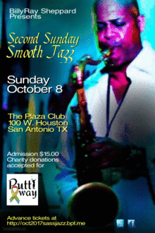 BillyRay Sheppard, San Antonio's premier Smooth Jazz Artist brings together some of San Antonio's finest musicians in superb environments, great people and good food monthly for a party with a purpose. This month's party benefits Putt Away Cancer. Come out and bring your friends for smooth jazz with a view at the Plaza Club located on the 21st floor of the Frost Bank Building. Free covered parking available in the Frost Bank garage entrance on Main Street.