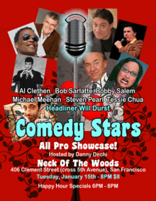 Comedy Stars Pro Showcase at Neck Of The Woods! Hosted by Danny Dechi - Comedian and world's only pencil musician Featuring Top Bay Area Comedians: Al Clethen, Bob Sarlatte, Bobby Salem, Michael Meehan, Steven Pearl, Tessie Chua, headliner Will Durst This is going to be a hilarious fantastic show! Rarely do you see such stars performing on the same stage!