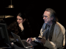 Media artists Aleksandra Dulic and Kenneth Newby conceptualized the visuals, with significant input by artists Jessica Dennis and Amberley John. The visual team of the Centre for Culture and Technology at UBC Okanagan created a multimedia presentation of animated images to be performed in real-time. Aleksandra Dulic, PhD, media artist, is an Associate Professor in Creative Studies and Director of the Centre for Culture and Technology. Kenneth Newby is a media artist, composer-performer, educator, interaction designer, and audio producer. Aleksandras and Kenneths collaborative creative practice explores the use of technology to enable media performances and installations that are rich in aural, visual and cultural nuances.Artist Jessica Dennis acted as lead animator and coordinator, and Indigenous artist Amberley John illustrates and tells the story of the three Brothers and Giant Bear. Her participation in the project was not funded by Canada 150, instead by UBC Work Study and Oneida Employment and Training. Many ukwehuwe (First Nations) will not be celebrating Canada 150, as there are still many unfulfilled promises and a lack of recognition of Aboriginal Rights and Treaties in Canada today. The animation and illustration team also included artists Ardanna Semeschuk, illustrating the Greek heroes; Dianne Schnieders, illustrating the Weaver Woman story; Sarah Polak and Charles Landa, providing animation; with additional drawings by Taiwanese artist Li Tung.