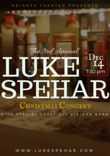 Luke Spehar invites you to his 3rd Annual Christmas Concert at the classic and historic Heights Theater! Special guests will be joining Spehar on stage to bring you a fun and engaging evening that is sure to leave you singing Christmas tunes and eager to celebrate the Christmas season. This year Aly Aleigha Band will be opening and will be featured throughout the evening. Don't miss the Third Annual Christmas Concert and bring your family and friends!