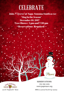 Treat yourself, your friends, and your family to "CELEBRATE" as P'Opera! ushers in the most wonderful time of the year! Plan to complete the evening with a delectable selection of food and beverages, sold separately thru Napa-Sonoma, to satiate your appetite.