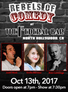 It's Rebels of Comedy at the Federal Bar in North Hollywood. Come out and see a night of live comedy, featuring an awesome lineup of professional features and headliner comedians. Hosted by Justin Work, with Emilia Barrosse, Rick Cummings