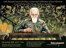 A holiday celebration of the life and works of an American legend known for marrying Eastern and Western musical traditions, performed in partnership with Chicago Balinese Gamelan In celebration of the holiday season, Fulcrum Point New Music Project will partner with Chicago Balinese Gamelan to honor American iconoclast composer, Lou Harrison and perform his most beloved works. Composer, environmentalist and gay activist, Lou Harrison (1917 2003) is best known for blazing new paths in music by invigorating the Western canon with musical influences from all over the world, creating his own musical instruments, and experimenting with microtones. With superb craftsmanship he combined a reverence for world cultures, a passionate belief in social equity and a love of melody and beauty in all its forms, to create his own musical revolution. Harrison was heavily influenced by gamelan music; The orchestra of gongs, metallophones, drums and bamboo flutes that make up Indonesian gamelan music has inspired and influenced composers worldwide for its stunning sounds and vivacious rhythms. Gamelan music is used in Bali, Indonesia as a method of religious worship, celebration and offering to the many Balinese Hindu gods and goddesses. In addition to the gamelan music, the concert will include a performance of traditional Balinese dance. Since Fulcrum Points inception, the Annual Concert for Peace has been our holiday concert, celebrating societal good will to all and the shared virtues of kindness, compassion, generosity, joy, and peace. The concert shines a spotlight on humanitys struggles and achievements in the order to inspire acceptance, inclusion, and love through music. This will be our 19th Concert for Peace, marking 2018 as our 20th anniversary serving Chicago as a platform for new art music. The Program: Solstice Varied Trio Songs of the Forest New Moon About Chicago Balinese Gamelan: Chicago Balinese Gamelan was formed in August 2017 by Claire Fassnacht with generous support and guidance from Pak Nyoman Mahartayasa, Pak Asnawa Tutde and High Concept Labs (HCL). During the fall of 2017, CBG was chosen as one of HCLs Sponsored Artists to receive rehearsal space and administrative support as the group was launched. Comprised of 18 members, CBG is a community-centered ensemble that aims to create high-intensity, exciting, quality performances while introducing and engaging communities to Indonesian culture, music and dance through performances, lectures and interactive workshops. $15 General Admission; $10 Students/Seniors Location: Merit School of Music: Gottlieb Hall