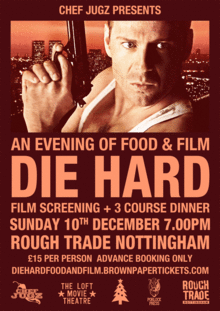 The ticket price includes a screening of Bruce Willis action classic Die Hard, and a seasonal three course dinner.