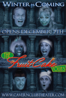 Past Review by Danny Lemos: Christmas comes every year along with the arrival on the Silverlake cabaret scene, evidenced quite literally underground, of the Fruitcake Follies at the Cavern Theater under Casita Del Campo restaurant. Former Disney theme-park performer James Gray and his band of fellow singers/actors/dancers/miscreants produce a cozy and entirely professional holiday farce complete with a boffo cast, deluxe musicality and detailed sets. The mix is 30 percent schmaltz, 30 percent camp, and 90 percent humor. The foundation of the show is the witty lyrics and music. And that is the nature of this show. Funky, loose, and fun, though not the slightest bit of professionalism is lost in the down-home feel to the performance.