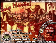 Come cheer on The Ocala Cannibals Roller Derby team as they take on the Lakeland Derby Dames in their first bout of the 2013 season. Doors open at 6:00 and the bout starts at 6:30. The entry fee is $8 in advance and $12 at the door and as always kids 12 and under are free. Remember seating is limited so bring your favorite fold out chair. Come cheer on your favorite derby girls as they hit the track for what is to be another great season.