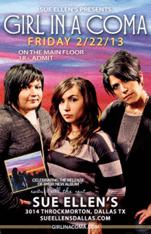 Girl in a Coma returns to the main floor of Sue Ellens. 18+ welcome. "Cruisin' the Crossroads" is suspended for this special event.