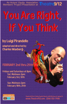 The circus of current politics adds new acts almost daily, but a persistent cloud hanging over the country is the tunnel-vision view of our own opinions that prevents honest exchange, compromise and growth. Luigi Pirandellos 1917 comedy, Right You Are, If You Think You Are, offered that the truth of reality is only as strong as the beliefs in our minds. Theatre9/12s artistic director, Charles Waxberg, adapts the comedy for a modern audience at a time when reality is our opinions, and the other side is the enemy. You Are Right, If You Think, in its world premiere, tells the story of a suspicious family that moves into a city "some time ago, but not too long" and excites the whole neighborhood to investigate their peculiar lives.
