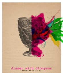 Dionysus god of liberation, winemaking, wine, animals, plants, fertility, and ritual madness... the persecuted god, the mad one whose appearance sends mankind into mania, the suffering and dying god - invites you to dinner. Complete with wine, food and plenty of ecstatic pleasure.