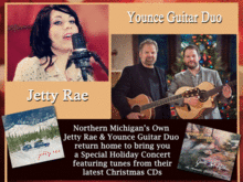 Northern Michigan's Own Jetty Rae and Younce Guitar Duo return home to bring you a Special Holiday Concert featuring tunes from their latest Christmas CDs. Jetty Rae's powerful and melodic voice is just right for bluesy folk rock. Her voice and moving lyrics carry her audience to a depth like few others can. Her Christmas album gets right to the heart of the meaning behind the holiday.