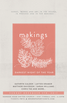 a round style concert with three musicians, a live poet and live painter sharing songs, words and art all that are in process or in the makings.