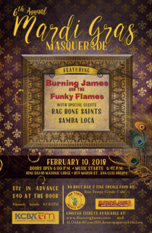 Burning James and Bon Temps Creole Cafe team up again for the 6th annual Mardi Gras Party at the King David Masonic Lodge of San Lusi Obispo!