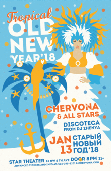 Dear friends, we are happy to announce Chervona's "Signature Party", 12th annual Old New Year Tropical Party - 2018 - Sat, Jan 13h, at Star Theater Portland!