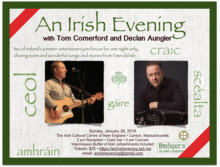 Two of Ireland's premier entertainers, Tom Comerford and Declan Aungier, join forces for one night only, in Canton, Massachusetts, sharing warm and wonderful songs, tunes and stories from the Emerald Isle.