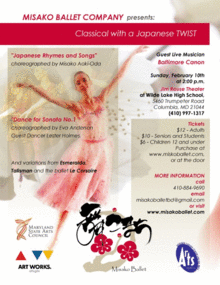 This concert will feature "Japanese Rhymes and Songs" choreographed and directed by Artistic Director, Misako Aoki-Oda. The program will include "Dance for Sonata No. 1" choreographed by Eva Anderson and variations from "Esmeralda", "Talisman", and the ballet "Le Corsaire". The Baltimore Canon will provide a musical interlude. "Classical with a Japanese Twist" features company dancers; Genevieve Ellis-Williams, Melissa Lineburg, Jessica Markiewicz, Jessica McElvaney, Emily Runkle, Amanda Wade, guest artist Lester Holmes and the Misako Ballet Junior Company. Please join us for this concert on Sunday, February 10th at 2:00 p.m. at the Jim Rouse Theater at Wilde Lake High School, 5460 Trumpeter Road, Columbia, MD 21044. Ticket prices are $12 for adults; $10 for seniors and students; and $6 for children 12 and under. Tickets may be purchased through Brown Paper Tickets or at the door.