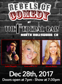 It's Rebels of Comedy at the Federal Bar in North Hollywood. Come out and see a night of live comedy, featuring an awesome lineup of professional features and headliner comedians. Hosted by Justin Rupple. Starring Kara with a "K", Nicole Burch