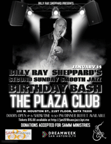 BillyRay Sheppard and San Antonino's finest musicians come together to share smooth jazz, rhythm and blues plus lots of fun to celebrate his birthday and Dreamweek. This month's edition celebrates his birthday for a fun-filled night. A buffet dinner is optional.