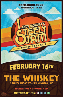 "Consistently stellar" (Price, PA Musician Mag), "Andy Mowatt's Steely Jam" is a funk-driven powerhouse from Pennsylvania, led by guitarist Andy Mowatt, "an absolute musical genius" (Devoy, Tellus 360) and "jazz-rock flamethrower on guitar" (Campbell, Gigspots). A fusion of New Orleans and Central PA, Mowatt's "bright arrangements keep things sounding fresh" (PA Musician) and "inspire you to expand your mind and think outside the confines of traditional jazz, soul and funk!" (Robert, Positive Music Reviews). "Confident, to-the-point, and elegant" (Rocha, The Flinging Times), Andy and his group entertain and impress crowds with unique originals and modern twists on classic hits, "and yet, through many influences, each tune retains a sound that is distinctly Mowatt's" (O'Brien, Fly Magazine).
