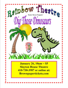 Rainbow Theatre at Slayton House will finish this seasons series with the ever popular Beale Street Puppets performing Dig Those Dinosaurs on Friday, January 26, 2018. The past is alive with prehistoric performers! Our extinct entertainers, Elvis Saurus and Ted Pterodactyl join the Fossil Follies. Dont miss our madcap marionettes Ice Age Antics! The puppet show is at 10:00am in the Slayton House Theatre in the Village of Wilde Lake in Columbia. Tickets may be purchased at the door for $5 each; exact cash or check only, $20 minimum for credit cards, no reservations, no refunds. Online tickets at BrownPaperTickets.com keyword/rainbow theatre. Group rates. For information call 410-730-3987. Sponsored by Wilde Lake Community Association. For a copy of this seasons brochure email: events@wildelake.org.