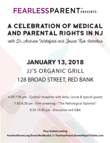 Fearless parents and friends, join Dr. Andrew Wakefield and Louise Kuo Habakus for a gathering in like-minded community. Enjoy cocktails; organic, gluten-free food; a film screening; and an open discussion about organizing to protect our medical and parental rights in New Jersey.