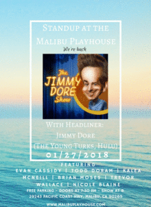 Returning to stage at The Malibu Playhouse for the 90-minute showcase is hilarious Headliner, Jimmy Dore of The Jimmy Dore Show (TYT, Hulu, Aggressive Progressives).