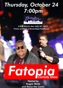 It's all in the name "Fatopia" is a comedy showcase brought to you by Reggie Wade and Rocco the Comic of Big Boned Productions. "Fatopia" will literally and figuratively bring you the biggest (or average sized, we don't discriminate) and brightest comedians in the New York City comedy circuit! The show is large and in charge, and will prove that once you go fat, it's pretty hard to go back.