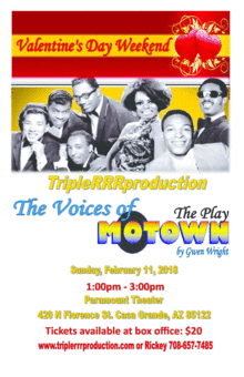 TripleRRRproduction The Voices Of Motown Play. Play writer Gwen Wright is directing this play about Barry Gordy, Marvin Gaye, David Ruffin, Stevie Wonder & Diana Ross. The play is at the beautiful Paramount Theatre with songs and entertainment with the cast of Tracy Sanders, Eric Harris, Cree Turner, Joseph Ewing and Phillip Brown. There will be snacks & refreshments sold at the Theatre.