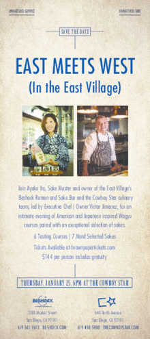 Join Ayaka Ito, Sake Master and owner of the East Village's Beshock Ramen and Sake Bar and the Cowboy Star culinary team, led by Executive Chef/Owner Victor Jimenez, for an intimate evening of American and Japanese inspired Wagyu courses paired with an exceptional selection of sakes.