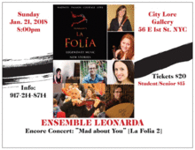 An encore presentation of Ensemble Leonarda's collaboration with Filmelodic on their "La Folia" project (film + live music). A visual anthology of 24 short stories, this 12-minute film is drawn from the imaginations of over a dozen different people and all inspired by variations on the same ancient melody. Ensemble Leonarda will explore works from such composers as Geminiani, Purcell, J.S. Bach, and Handel, who were among the over 150 baroque composers inspired by this tune.