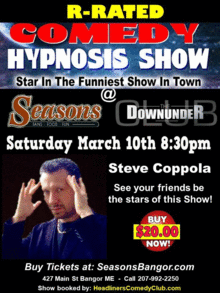 Watch your friends become the star of the show coming up at the Downunder Club this Saturday, March 10th at 8:30 p.m. Seasons and the Dowunder Club will be hosting the funniest show in town as Steve Coppola, the R-Rated Hypnotist, puts on a show you won't want to miss. Tickets are just $20 each (before fees) as they last!
