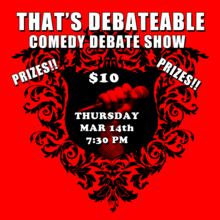 What happens when comedians are posed with tough questions and have only 3 minutes to figure out their arguments in a double elimination tournament?!? Every Second Thursday we bring 4 of the finest comics in our fair city to argue over things they care about, have no interest in, or plain just have to make up something on the fly to win cash monies! With lots of fun filler rounds with the audience (Participation may be required) for great prizes while the comics craft their arguments. Things will get ugly, funny, there may be tears, but there will definitely be laughs and a good time. JOIN US to find out who is the MASTER DEBATER!