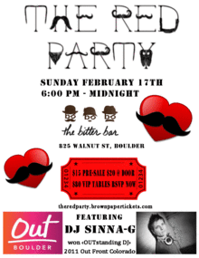 @The Bitter Bar on Sunday, February 17th from 6pm-midnight. Our private party will feature a cocktail hour and mixers lounge from 6:00-7:30, red light dance floor from 7:30 to close. Sweet HaPpY HoUr pricing on delicious appetizers, select drinks and a full cash bar. We will have signature cocktails, VIP tables, Dance floor, a performance by La Galla Queer Performance Collective and epic Denver DJ Sinna-G spinning top-40 hits all night long.