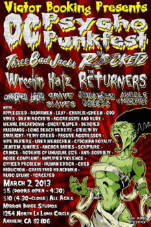 Stage A (Main Stage) 300-320 APPLESEED 330-350 RADARMEN 400-420 LEAF 430-450 CHARLIEXSHEEN 500-520 DEATH ROCKETS 530-550 AGGRESSIVE AND RUDE 600-620 MENTAL BREAKDOWN 630-650 SHORT TEMPER 700-720 DEVOTED HUSBANDS 730-750 LONG BEACH HERETIX 800-820 STEALTH BY STARLIGHT 830-850 FILTHY GREED 900-920 PASSIVE AGGRESSOR 930-950 ANGELS OF MISCHIEF 1000-1020 WIFE BEATERS 1030-1100 WRECKIN KATZ 1115-1140 THE ROCKETZ 1150-1210 THE RETURNERS 1220-1240 RUDO SKUNKS Stage B (Side Stage)