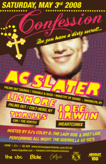 Blog superstars: AC Slater (palms out sounds, ministry of sound, NYC) Lismore (palms out sounds, cult-hero, NYC) and Joee Irwin (iheartcomix, PDX) join our residents to create a night so dirty, youll have to confess!