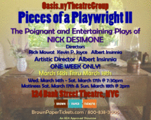 Oasis.nyTheatreGroup founded by Broadway, film and television veteran Albert Insinnia will present Pieces of a Playwright II at 124 Bank Street Theater, NYC from Wednesday, March 14, 2018 through Sunday, March 17, 2018 @ 7:30. There will be a matinee @ 2:00 p.m.and evening performance on Saturday March 17, 2018 @ 7:30 p.m. Matinee at 2:00 p.m. only on Sunday March 18, 2018.