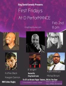 The First Friday of every month we put together a great lineup of stand-up comedy and/or improv. This month's show features King-David Lane as your host with a stacked line up of Chicago/NWI talent B Wright, Kate Peterson, Koffe Black, Keegan Damron, & Mistaa Brown! Tickets are $7 if you buy in advance by clicking the link below or $10 at the door.