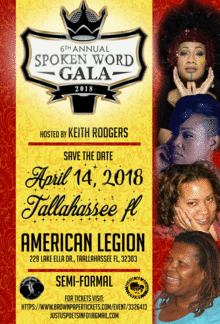 The 6th Annual Spoken Word Gala will be held at The American Legion in Tallahassee Fl, Come out and be a part of this Historical event as we place Poets, and spoken word artist from all over the country in the same room on one night for an amazing event, Honoring the careers and the hard works of Poets and Spoken word artist from all over. The night will be filled with performances from more than 20 poets. This is a Semi Formal event, dinner will be served before the start of the show... This Years Gala will be hosted by KEITH ROGERS (BLACK ON BLACK RHYME)
