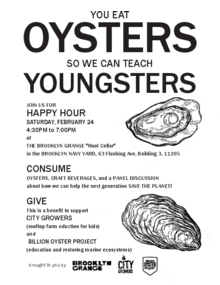 COME PARTY FOR THE PLANET! Learn more about the work of New York City's leading environmental educational organizations while enjoying freshly shucked oysters! Come to this "friendraiser" benefit for two inspirational non-profits, Billion Oyster Project, and City Growers, and mingle with environmental educators as you sample oysters topped with delicious, inventive garnishes and paired with craft beverages. We'll hear directly from the folks who are teaching the next generation how to repair our ecosystem and our food system on a brief panel about their work. Come learn about the amazing work being done in your back yard, and find out how you can get involved in the movement.