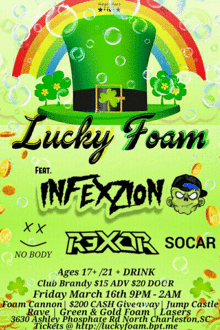 We invite you to join our largest St. Patrick's Day Foam rave. Not only have we upgraded to a state of the art foam jet cannon for this event that shoots 30 feet in the air but also changes different color foam that will make this whole theme an unforgettable party experience. Some of the best electronic djs in the state will be throwing down while you dance the night away in total euphoric bliss! Invite your friends to the page an watch the hype grow!