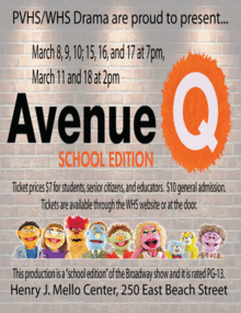In a collaboration between the talented students of both schools, WHS and PVHS students will work together to present the side splitting hit musical comedy, Avenue Q School Edition. This Broadway hit, with equal parts puppetry, comedy and a great musical score, has been adapted for the school stage from the original production, which won the Tony "Triple Crown" for Best Musical, Best Score and Best Book. Avenue Q School Edition is a laugh-out loud musical that tells the timeless story of a recent college grad named Princeton who moves into a shabby New York apartment all the way out on Avenue Q. He soon discovers that although the residents seem nice, it is clear that this is not your ordinary neighborhood. Together, Princeton and his new-found friends struggle to find jobs, dates, and their ever-elusive purpose in life. Filled with gut-busting humor and a delightfully catchy score, not to mention puppets, Avenue Q is a truly unique show that has quickly become a favorite for audiences everywhere.
