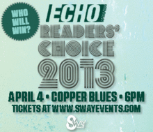 Join Echo Magazine and SWAY Events on Thursday, April 4th starting at 6PM at Copper Blues as we honor the people and places that Readers have voted as the 2013 winners of the ECHO Readers' Choice Awards! This fun-filled, action-packed awards ceremony will be the talk of the town by all the nominees, winners, and ECHO enthusiasts!