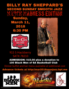 BillyRay Sheppard and some of the best musicians in our city heats up the Eastside for the March Madness Edition of Second Sunday Smooth Jazz. In its fourth year of Second Sunday Smooth Jazz, BillyRay has made marked difference in San Antonio as he partners with non-profits to bring awareness of their cause while combining the best locations, great music, good food and good times. This month is no exception as BillyRay's charity partner is the 100 Black Men of San Antonio Basketball Program.