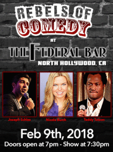 It's Rebels of Comedy at the Federal Bar in North Hollywood. Come out and see a night of live comedy, featuring an awesome lineup of professional features and headliner comedians. Hosted by Justin Rupple. Starring Kara with a "K", Nicole Burch