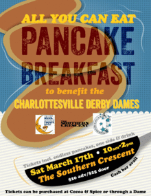 Please join the Charlottesville Derby Dames in collaboration with Blue Moon Dinner and The Southern Crescent for CDD's All You Can Eat Pancake Breakfast Fundraiser! Start off your St. Patrick's Day festivities with unlimited pancakes, your choice of side, and drink. There will also be live music and a cash bar available!