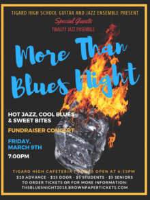 Mark your calendar for Friday, March 9th, 2018 ~ Tigard High School's annual night of sizzling jazz, soulful blues and sweet bites. Exciting raffle items and a silent auction will add to the fun! Adults $10 in advance/$15 at the door; Students/Seniors $5; Reserved Table for 8, $100. Get your tickets now for this popular event!
