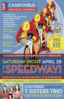 Inspired by the cult-classic, coming of age film Breaking Away and Indiana Universitys Little 500 race, CampoVelo is proud to announce Saturday Night at the Speedway. The feature event of the evening will be a team relay race around the half-mile track. Teams of four will send racers around the track, one at a time, in hopes of becoming the fastest team to get all four riders across the finish line. Instead of a baton to pass in the transition zone, riders will pass single-speed bikes. Prizes will be awarded for first, last, and most laughable! Proceeds from the event will help support the Napa Valley Vine Trail, a non-profit coalition dedicated to building a class 1 paved bike path from Calistoga to the Vallejo Ferry. To date, 19.5 miles have been constructed of the 47-mile plan.