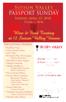 Experience a rite of passage into spring, a day of award-winning wines and wine country inspired food across 12 participating Suisun Valley venues at the the 2018 Passport Sunday.