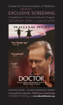 Center for Communication in Medicine presents and exclusive Screening of "The Doctor" starring William Hurt.Loosely based on Dr. Edward Rosenbaum's 1988 book, A Taste Of My Own Medicine. The film stars William Hurt as Jack MacKee, a doctor who undergoes a transformation in his views about life, illness and human relationships. SpeakSooner.org is an initiative of the nonprofit Center for Communication in Medicine (CCM). Founded in Bennington, Vermont in 2006, CCMs mission is to educate patients, families and healthcare professionals about the key role of communication in improving healthcare delivery. SpeakSooner.org and the Difficult Conversations Workbook have been developed to empower patients to assert their role in the healthcare dialogue and become active partners in planning their own care.